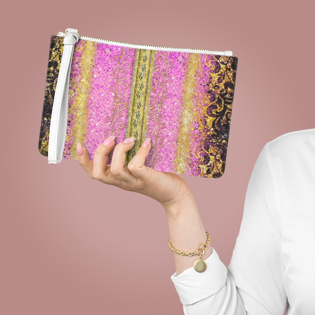 Designed with a loop handle to quickly free your hands, this custom clutch bag is made for the fashionista on the go. It can hold everyday essentials such as a phone, wallet, and keys. It features a zip fastening and a fully lined internal pocket. It is made of vegan leather in the Saffiano pattern finish that was invented by Prada.