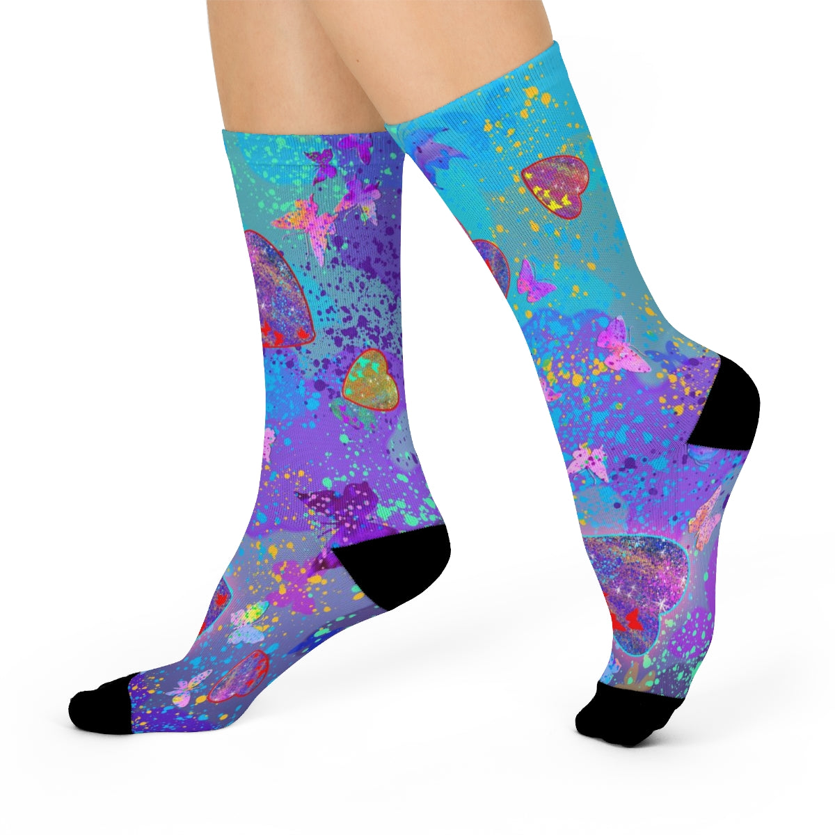 These funky socks are a one-size-fits-all solution up to a men’s size 12. The base color is white with black on the toes and heel. The construction is 73% polyester, 18% nylon, 6% spandex, and 3% cotton. Colorful, fun and comfortable - you have a chance to style-up your footwear. These are great little gifts as well.