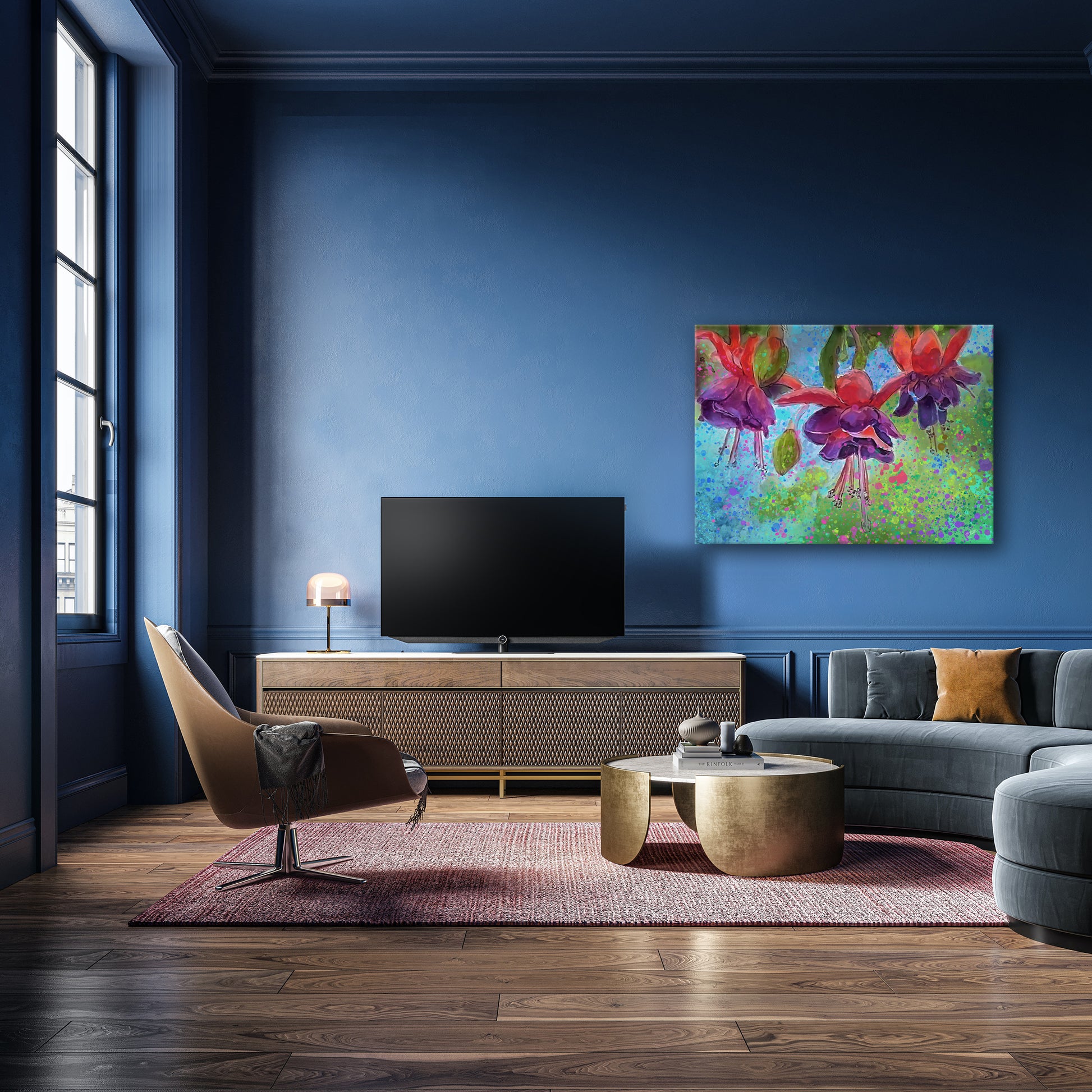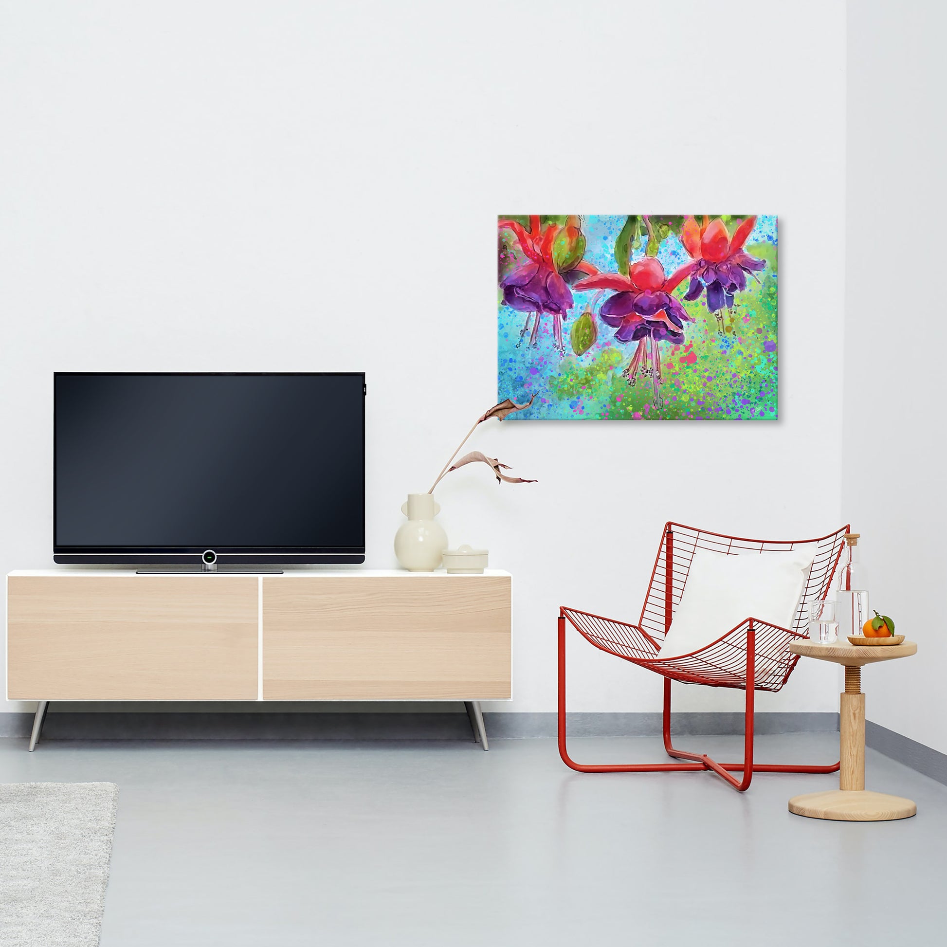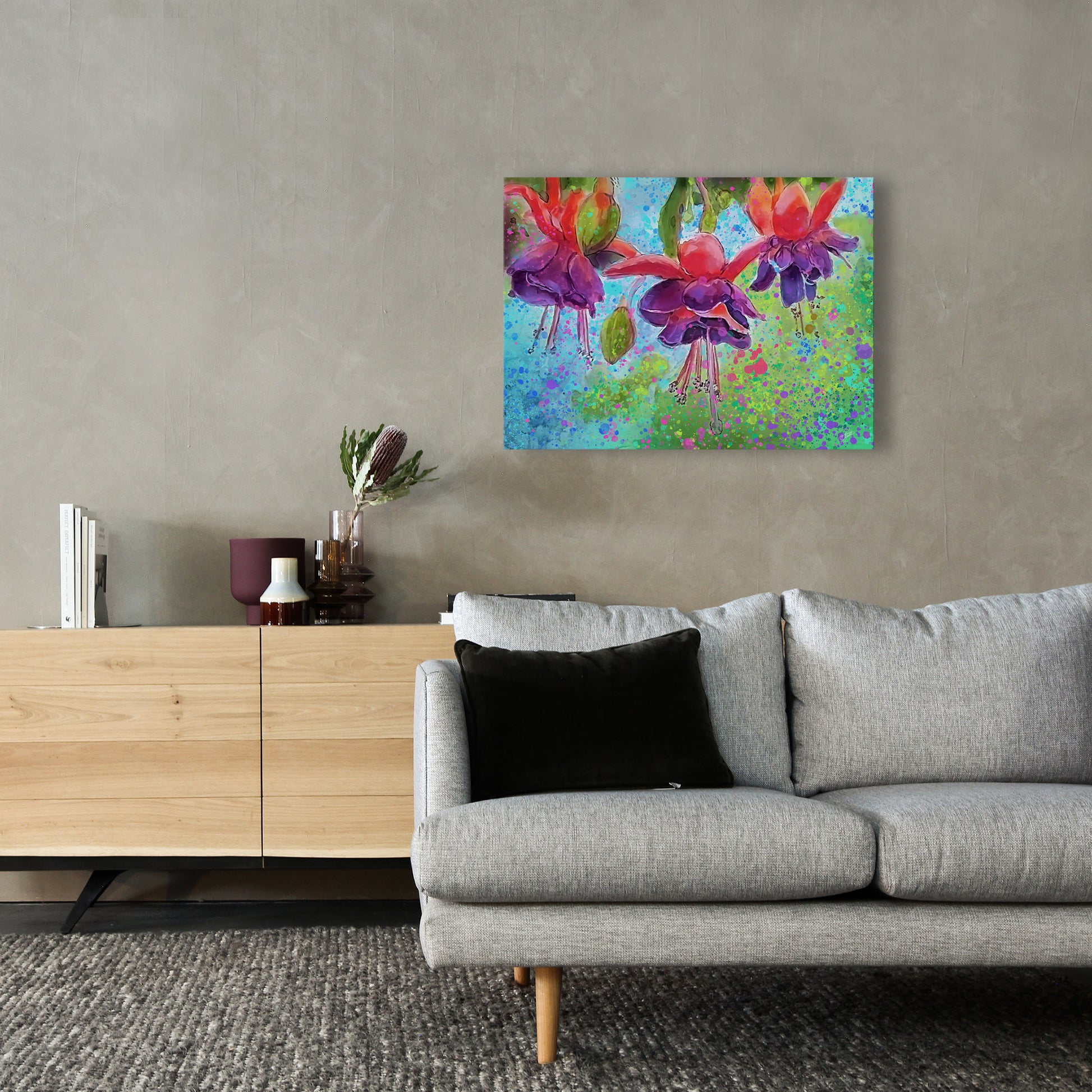 This painting will be printed onto one of our premium canvases and then stretched on a wooden frame of 1.5" x 1.5" stretcher bars. Your canvas print will be delivered to you "ready to hang" with pre-attached hanging wire, mounting hooks, and nails.