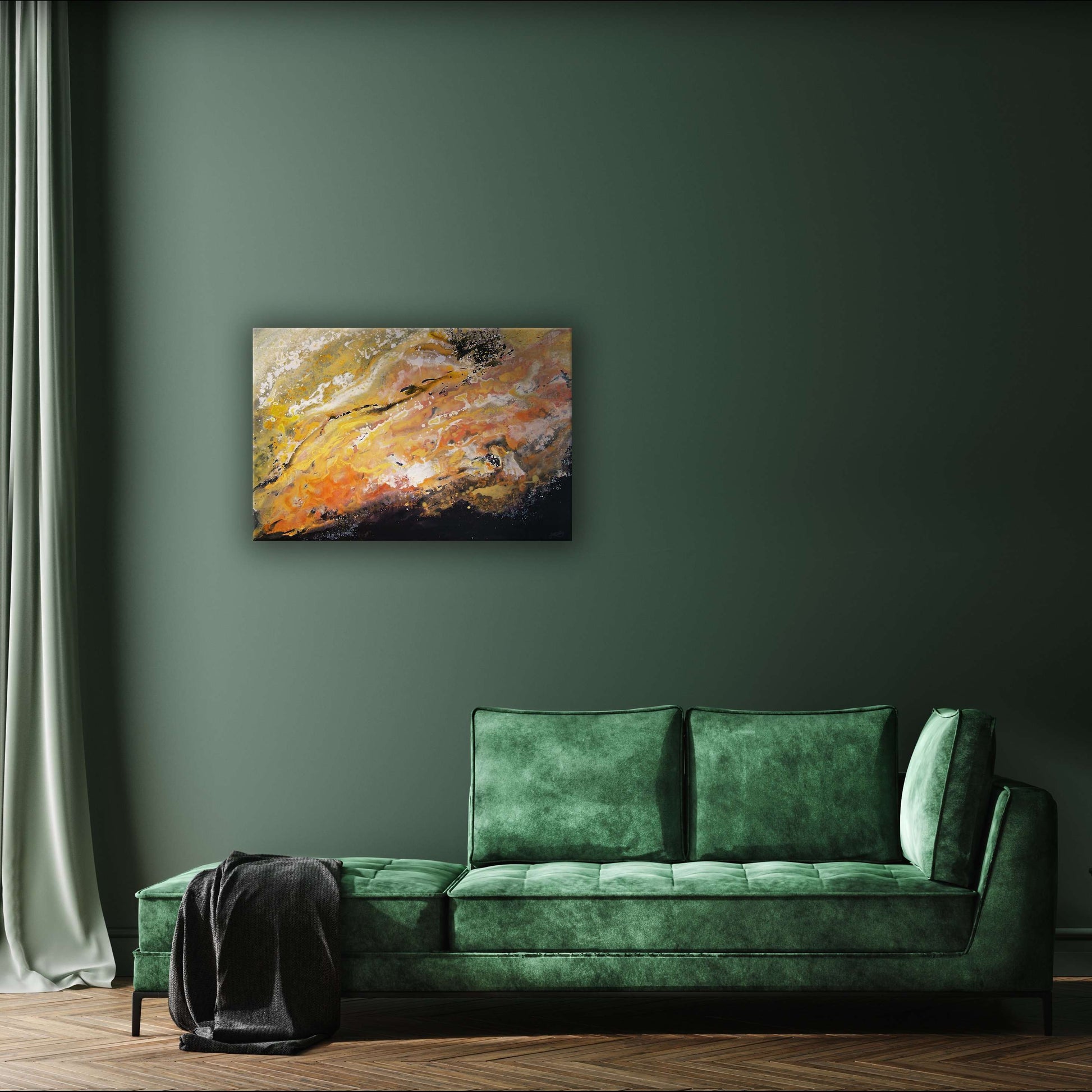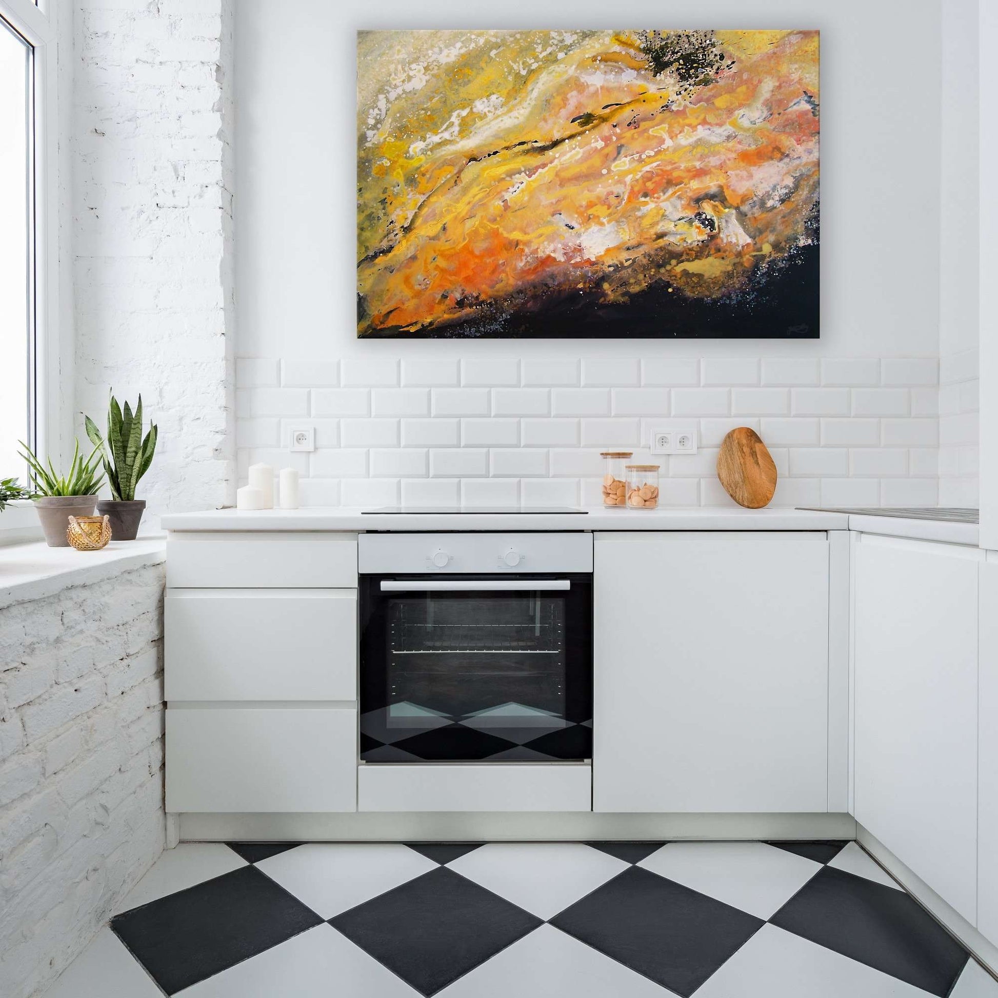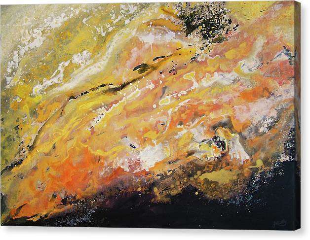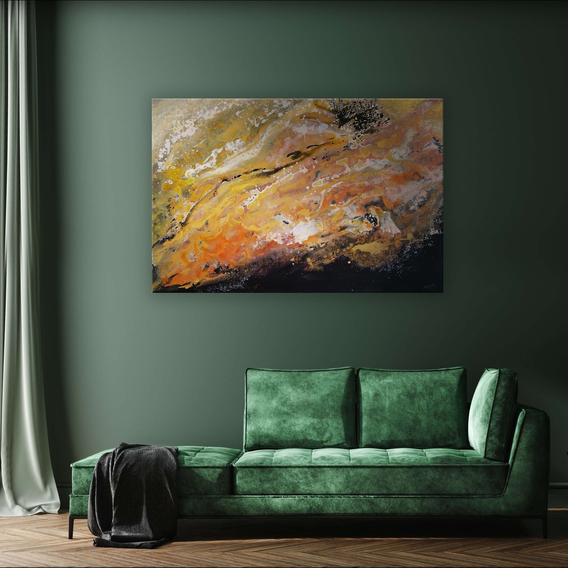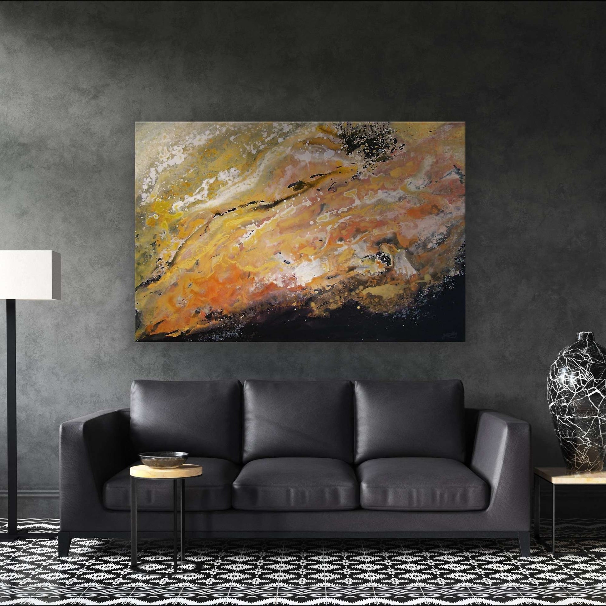 This painting features a black base with yellow and orange overtones and accents of whites and golds that perfectly depict the